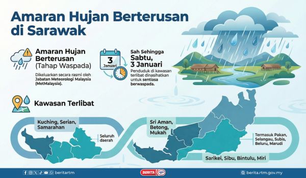 KUCHING, 1 Januari – Jabatan Meteorologi Malaysia (MetMalaysia) mengeluarkan Amaran Hujan Berterusan tahap Waspada melibatkan 10 daerah di Sarawak yang dijangka berlarutan sehingga Sabtu ini (3 Januari).