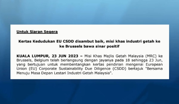 Ia bertujuan membentangkan kertas pendirian mengenai European Union (EU) Corporate Sustainability Due Diligence (CSDD) bertajuk "Bersama Menuju Masa Depan Lestari Industri Getah Malaysia".