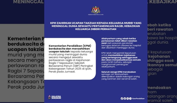 Jelas kenyataan itu, keputusan membatalkan kejohanan sehingga esok dan menjadualkan semula perlawanan pada tarikh baharu adalah bagi menghormati pemergian murid tersebut.
