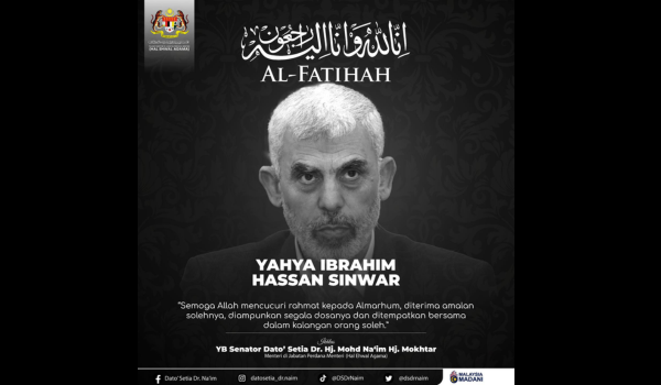 Menteri di Jabatan Perdana Menteri (Hal Ehwal Agama), Datuk Dr. Mohd Na’im Mokhtar berkata, semangat perjuangan Yahya Sinwar dalam mempertahankan tanah Palestin dan Masjid Al-Aqsa akan terus dikenang oleh umat Islam di seluruh dunia.