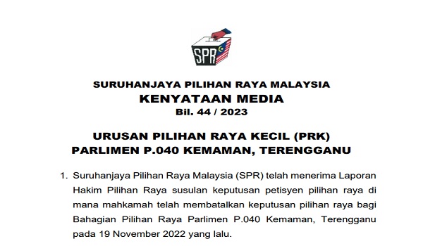 KUALA LUMPUR, 11 Oktober- Suruhanjaya Pilihan Raya Malaysia (SPR) akan mengeluarkan notis Pilihan Raya Kecil (PRK) bagi mengisi kekosongan kerusi Parlimen Kemaman, susulan mahkamah telah membatalkan keputusan pilihan raya parlimen itu pada 19 November tahun lepas.