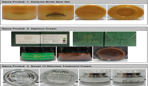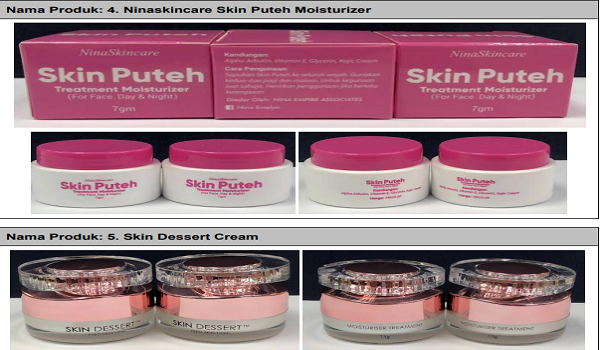 Ketua Pengarah Kesihatan Tan Sri Dr Noor Hisham Abdullah berkata produk tersebut ialah Sweet 13 Skincare Treatment Cream, Ninaskincare Skin Puteh Moisturizer dan Skin Dessert Cream, masing-masing mengandungi merkuri manakala Haemun Cream mengandungi miconazole dan Karisma Birds Nest Gel (hydroquinone dan tretinoin).