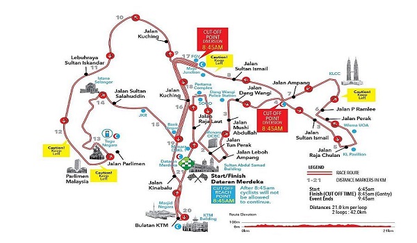 “Kayuhan bermula di Dataran Merdeka, Kuala Lumpur dan akan berakhir di lokasi yang sama melibatkan dua pusingan sejauh 42 kilometer,”katanya.