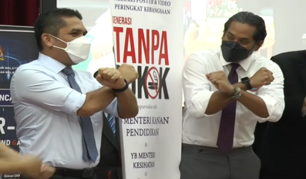 bersama Menteri Kanan (Pendidikan), Radzi Jidin (kiri) menunjukkan tanda silang tangan membawa simbolik”tidak” kepada rokok)