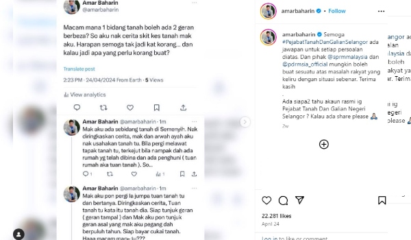 Perkara itu berikutan tanah milik keluarganya itu dikesan dikeluarkan geran kepada orang lain, dan beliau turut mempersoalkan pihak yang meluluskan geran kedua untuk individu lain.