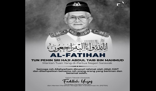 “Sedih dan dukacita di atas perginya negarawan, Ayahanda Tun Pehin Sri Hj Abdul Taib Mahmud, bekas Yang Dipertua Negeri Sarawak dan bekas Ketua Menteri Sarawak, awal pagi ini di sebuah hospital di Kuala Lumpur.