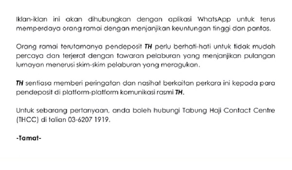 TH sentiasa memberi peringatan dan nasihat berkaitan perkara ini kepada para pendeposit di platform-platform komunikasi rasmi TH.