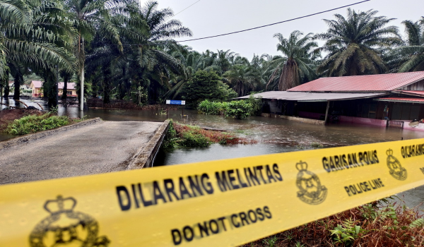 satu meter akibat banjir di Kampung Parit Penghulu Benteng dekat Sungai Rambai/Foto Bernama)