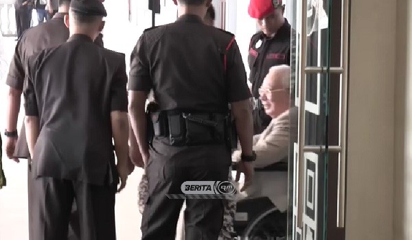 Terdahulu, Najib tiba di mahkamah dalam keadaan berkerusi roda selepas dimasukkan ke hospital baru-baru ini kerana keradangan lutut akut dan beliau juga dilihat berjalan perlahan-lahan dengan bantuan tongkat.