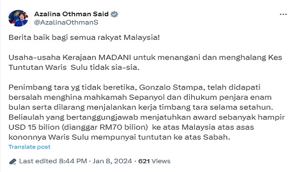 “Tahniah kepada semua rakyat Malaysia! Penimbangtara tidak beretika Gonzalo Stampa telah didapati bersalah atas tuduhan menghina mahkamah dan telah dijatuhkan hukuman penjara enam bulan oleh Mahkamah Sepanyol serta dilarang menjalankan kerja timbang tara selama setahun.
