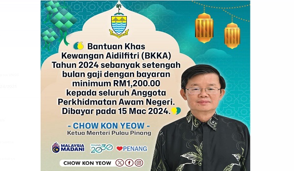 GEORGE TOWN, 7 Mac- Kerajaan Pulau Pinang meluluskan Bantuan Khas Kewangan Aidilfitri (BKKA) 2024 berjumlah setengah bulan gaji dengan bayaran minimum RM1,200 kepada seluruh anggota perkhidmatan awam negeri.