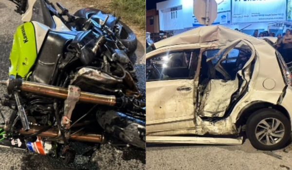 Semasa sedang membelok ke kanan, motosikal ditunggangi mangsa yang sedang bergerak lurus dari arah bertentangan iaitu dari arah Kangar ke Alor Setar tidak sempat mengelak dan melanggar bahagian pintu belakang sebelah kiri kereta.
