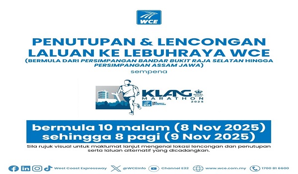 KUALA LUMPUR, 6 November - Beberapa laluan di Lebuhraya Pesisiran Pantai Barat (WCE) akan ditutup dan dilencongkan sementara bersempena penganjuran Klang Royal City Marathon 2025 pada Ahad, 9 November.
