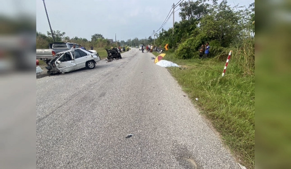 “Kereta mangsa dipercayai hilang kawalan lalu memasuki laluan bertentangan dan melintangi jalan.