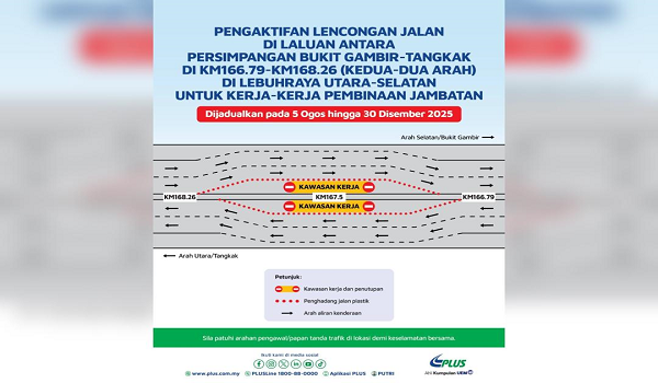 KUALA LUMPUR, 2 Ogos – PLUS Malaysia Bhd (PLUS) akan mengaktifkan lencongan jalan secara berperingkat di kilometer (KM) 166.79 hingga KM168.26 bagi kedua-dua arah di antara Persimpangan Bukit Gambir–Tangkak di Lebuhraya Utara–Selatan bermula dari 5 Ogos hingga 30 Disember 2025.