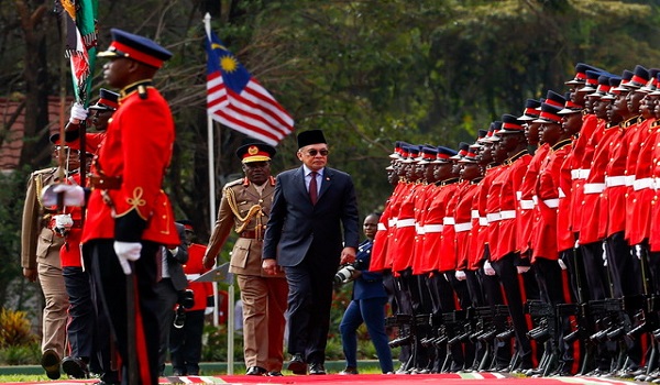 NAIROBI, 24 November - Perdana Menteri Datuk Seri Anwar Ibrahim diberi sambutan rasmi dengan 19 das tembakan meriam di Istana Negara Kenya, iaitu kediaman rasmi Presiden Kenya William Samoei Ruto.