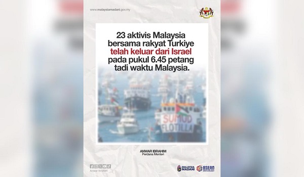 KUALA LUMPUR, 4 Oktober - Perdana Menteri, Datuk Seri Anwar Ibrahim menghargai usaha berterusan semua pihak yang membantu memudahkan usaha membawa keluar kesemua 23 aktivis Global Sumud Flotilla (GSF) dari Israel ke Turkiye.