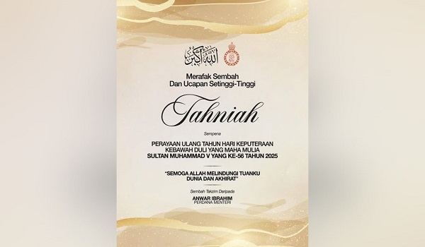 KUALA LUMPUR, 29 September – Perdana Menteri Datuk Seri Anwar Ibrahim merafak sembah tahniah sempena dengan sambutan Ulang Tahun Hari Keputeraan Ke-56 Sultan Kelantan, Sultan Muhammad V, hari ini.