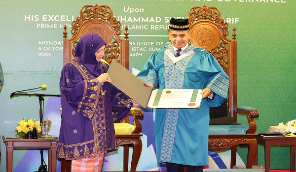 KUALA LUMPUR, 6 Oktober - Perdana Menteri Pakistan, Muhammad Shehbaz Sharif menerima Ijazah Kehormat Doktor Falsafah dalam Kepimpinan dan Tadbir Urus daripada Universiti Islam Antarabangsa Malaysia (UIAM).