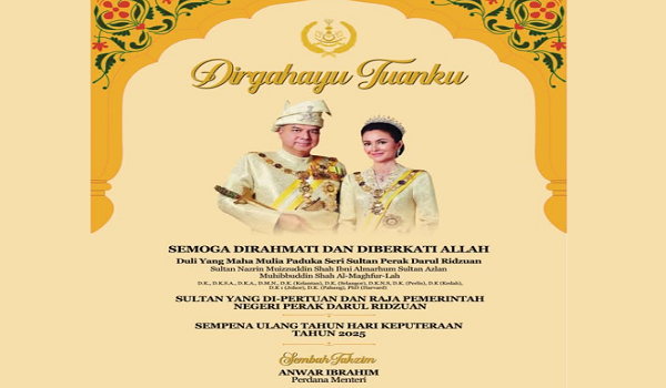 KUALA LUMPUR, 7 November -Perdana Menteri Datuk Seri Anwar Ibrahim mengucapkan tahniah kepada Sultan Perak Sultan Nazrin Muizzuddin Shah, sempena sambutan Ulang Tahun Hari Keputeraan baginda yang ke-69, hari ini.