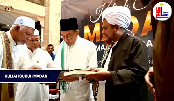 PUTRAJAYA, 16 Oktober- Perdana Menteri, Datuk Seri Anwar Ibrahim hari ini menyampaikan naskhah Mushaf (al-Quran) Tarim Riwayat ad-Duri ‘an Abi Amr wa al-Basr kepada tokoh ulama besar dunia Islam, Al-Habib Umar bin Muhammad bin Salim Ben Hafez.
