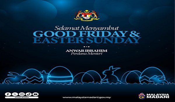 KUALA LUMPUR, 29 Mac – Perdana Menteri Datuk Seri Anwar Ibrahim hari ini mengucapkan selamat menyambut hari Good Friday dan Easter Sunday kepada seluruh penganut Kristian.