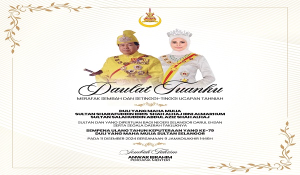 “Merafak Sembah dan setinggi-tinggi tahniah sempena Sambutan Ulang Tahun Hari Keputeraan Ke-79, Duli Yang Maha Mulia Sultan Sharafuddin Idris Shah AlHaj Ibni Almarhum Sultan Salahuddin Abdul Aziz Shah AlHaj, Sultan dan Yang DiPertuan Negeri Selangor Darul Ehsan serta segala daerah takluknya.