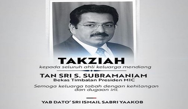 KUALA LUMPUR, 6 Julai– Perdana Menteri Datuk Seri Ismail Sabri Yaakob merakamkan ucapan takziah atas pemergian bekas Timbalan Presiden MIC Tan Sri S. Subramaniam, 78, yang meninggal dunia di rumahnya di Petaling Jaya, Selangor.