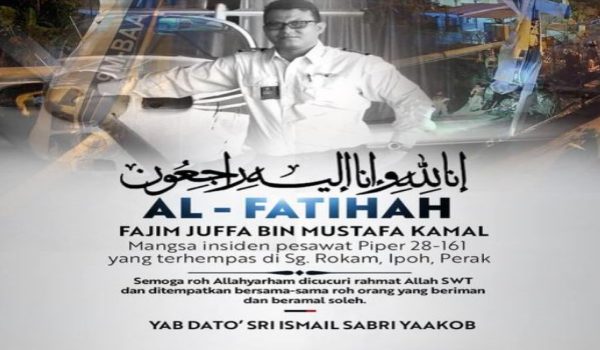 KUALA LUMPUR, 2 Ogos– Perdana Menteri, Datuk Seri Ismail Sabri Yaakob menzahirkan ucapan takziah kepada keluarga Allahyarham Fajim Juffa Mustafa Kamal, jurulatih penerbangan yang maut dalam nahas pesawat, PIPER 28-161 yang terhempas di Sungai Rokam, malam tadi.