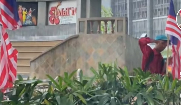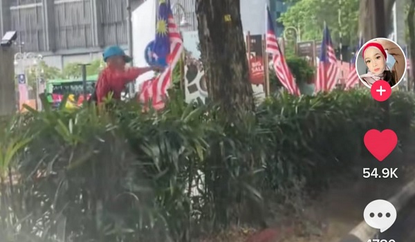 Rakaman video berdurasi 38 saat yang dimuat naik di Tik Tok menunjukkan lelaki berbaju merah dan memakai topi warna biru itu memegang gunting dan merosakkan beberapa kain bendera.