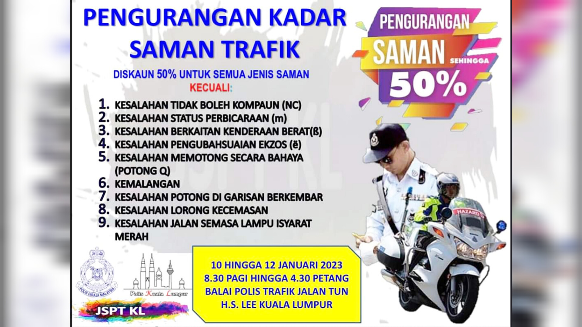 KUALA LUMPUR, 8 Januari- Polis Kuala Lumpur menawarkan diskaun sebanyak 50% bagi saman trafik bermula 10 hingga 12 Januari depan.