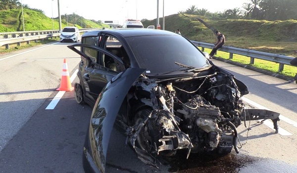 Siasatan awal mendapati, tayar belakang kenderaan yang dipandu pecah menyebabkannya hilang kawalan dan melanggar besi penghadang jalan.