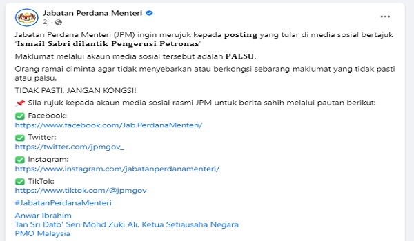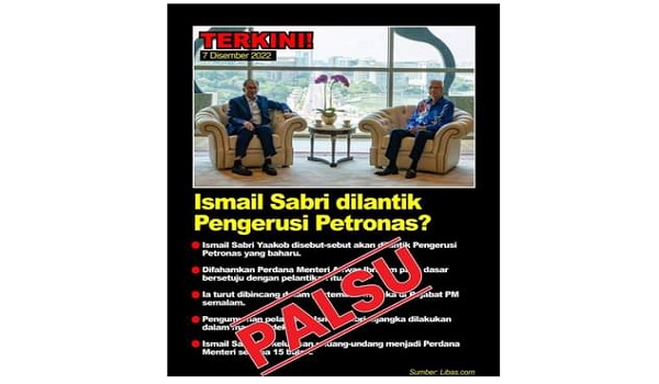 PUTRAJAYA, 7 Disember- Susulan poster tular di media sosial bertajuk ‘Ismail Sabri dilantik Pengerusi Petronas’, Jabatan Perdana Menteri (JPM) hari ini memaklumkan maklumat tersebut adalah palsu.
