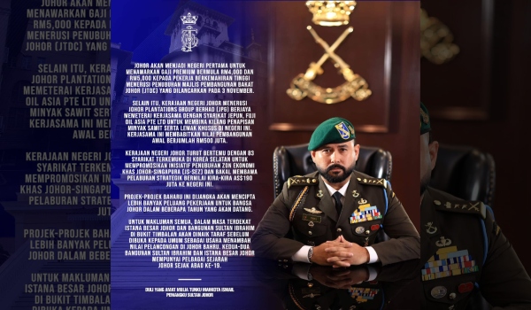 Pemangku Sultan Johor Tunku Mahkota Ismail menerusi satu hantaran di Facebook bertitah, projek baharu di negeri itu dijangka akan mencipta lebih banyak peluang pekerjaan untuk Bangsa Johor dalam beberapa tahun akan datang.