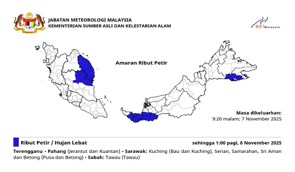 KUALA LUMPUR, 7 November - Jabatan Meteorologi Malaysia (MetMalaysia) mengeluarkan amaran ribut petir, hujan lebat dan angin kencang yang dijangka melanda empat negeri hingga 1.00 pagi Sabtu, 8 November 2025.