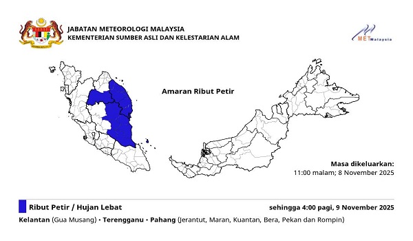 KUALA LUMPUR, 8 November - Jabatan Meteorologi Malaysia (MetMalaysia) mengeluarkan amaran ribut petir, hujan lebat dan angin kencang yang dijangka melanda Terengganu, Kelantan dan Pahang hingga 4.00 pagi Ahad, 9 November 2025.