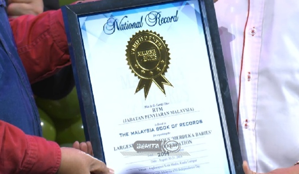KUALA LUMPUR, 31 Ogos- Program Himpunan Anak Merdeka anjuran Jabatan Penyiaran yang berlangsung serentak di seluruh negara itu berjaya mencatat ‘Sambutan Hari Lahir Anak Merdeka terbesar’ dalam Malaysia Book Of Records sebagai The Largest Simultaneous Merdeka Babies Birthday Celebration.