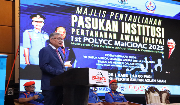 Datuk Seri Dr Shamsul Anuar bercakap kepada pemberita pada Majlis Pentauliahan Pasukan Institusi Pertahanan Awam (PISPA) sempena 1st Politeknik dan Kolej Komuniti (POLYCC) Malaysia Civil Defence Annual Camp and Commissioning di Politeknik Sultan Azlan Shah (PSAS), di sini.