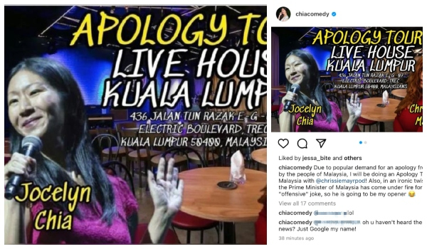 KUALA LUMPUR, 28 Jun – Belum pun reda isu mempersendakan rakyat negara ini, perancangan pelawak kontroversi, Jocelyn Chia memberi bayangan akan membuat persembahan ‘khas’ Apology Tour Live House Kuala Lumpur di TREC, di sini pada 28 Ogos depan.