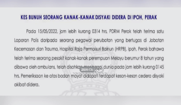 Ketua Polis Perak, Datuk Mior Faridalathrash Wahid berkata kanak-kanak tersebut disahkan meninggal dunia kira-kira pukul 1.45 pagi selepas dibawa ke Hospital Raja Permaisuri Bainun, di sini semalam.