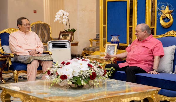 JOHOR BAHRU, 23 April- Sultan Johor Sultan Ibrahim Almarhum Sultan Iskandar dan Permaisuri Johor Raja Zarith Sofiah Almarhum Sultan Idris Shah hari ini berkenan menerima kunjungan dua Menteri Singapura bersempena sambutan Aidilftri di Istana Bukit Serene, semalam.