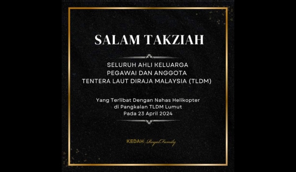 “Salam Takziah buat seluruh ahli keluarga Pegawai dan Anggota Tentera Laut Diraja Malaysia (TLDM) yang terkorban dalam nahas helikopter ketika raptai Sambutan Hari Ulang Tahun TLDM ke-90 yang dijadualkan akan berlangsung minggu hadapan,” menurut hantaran itu.