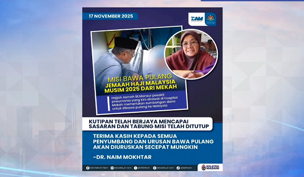 KUALA LUMPUR, 17 November – Kutipan Tabung Musa’adah JAKIM–YWM bagi membantu membawa pulang jemaah haji negara, Asmah Mansor, telah mencapai jumlah sasaran dan ditutup serta-merta.