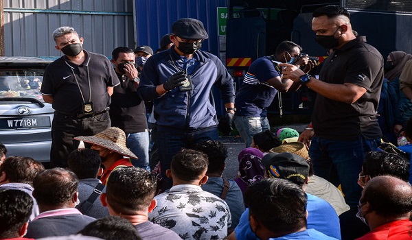(Datuk Seri Khairul Dzaimee(tengah) memeriksa pendatang tanpa izin yang ditahan oleh Jabatan Imigresen Malaysia ketika operasi yang dijalankan di Pasar Borong Selayang/BERNAMA)