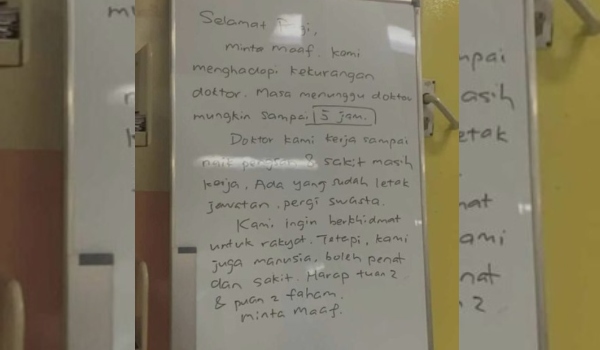 Ia dipercayai berlaku di sebuah hospital di Kedah yang memohon maaf kepada pesakit kerana perlu menunggu lama untuk berjumpa doktor.
