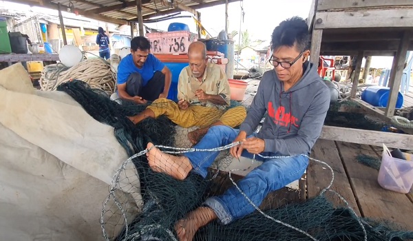 (Nelayan-nelayan mengisi masa lapang dengan menjahit pukat selepas tidak dapat keluar menangkap ikan pada musim tengkujuh)