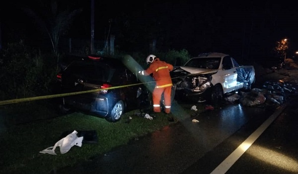 SETIU, 25 November- Tiga sekeluarga maut dalam kemalangan melibatkan sebuah kereta dan sebuah pacuan empat roda di Kilometer 53, Kampung Sungai Lerek, di sini, Terengganu, kira-kira pukul 4.30 pagi tadi.