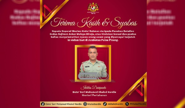“Syabas dan terima kasih Koperal Mazlan Abdul Rahman atas tindakan berani dan pantas menyelamatkan nyawa orang awam yang dipercayai terjatuh ke dalam laut di Jambatan Pulau Pinang.