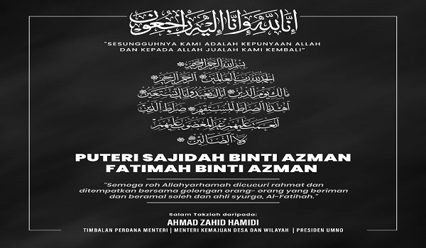 KUALA LUMPUR, 30 November– Timbalan Perdana Menteri Datuk Seri Dr Ahmad Zahid Hamidi mengucapkan takziah kepada ahli keluarga Puteri Sajidah dan Fatimah Azman yang terkorban dalam kejadian tanah runtuh di Kampung Bukit Apit, Ajil, Terengganu, semalam.