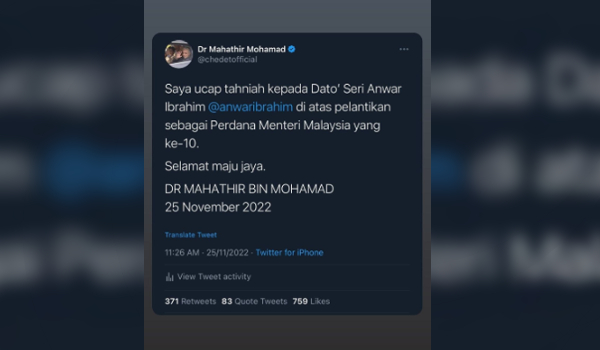 KUALA LUMPUR, 25 November– Bekas Perdana Menteri yang juga Pengerusi Pejuang Tanah Air (PEJUANG), Tun Dr Mahathir Mohamad mengucapkan tahniah kepada Datuk Seri Anwar Ibrahim atas pelantikannya sebagai Perdana Menteri Malaysia Ke-10.